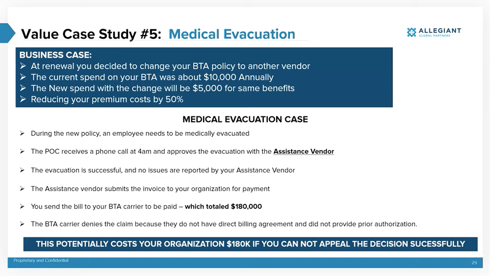 Recently, an organization decided to change BTA vendors to save $5,000. However, they did not realize that their insurance company required prior authorization for medical evacuations and did not have a direct billing agreement with the assistance vendor. So, when an employee fell ill and needed a medical evacuation — authorized by the organization’s point of contact (not the insurance company) — the client was faced with a bill of $180,000.